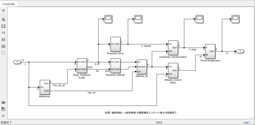 上記のお客様のご要望を最大限に考慮して、飛行制御に関する調査、検討を繰り返し、ドローンの一般的な基本制御の構成、制御器を決定し、制御器設計の後、シミュレーションによってその妥当性を確認しました。