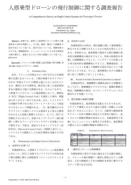 人の搭乗する大型機ドローンメーカーのベンチャー企業様からご依頼をうけまして、飛行制御に関する調査研究をやらせて頂きました。お客様のご厚意によりまして、事例紹介として内容を公開してよいというお言葉を頂きましたので、当社の実施しました技術サービスを紹介させて頂きます。